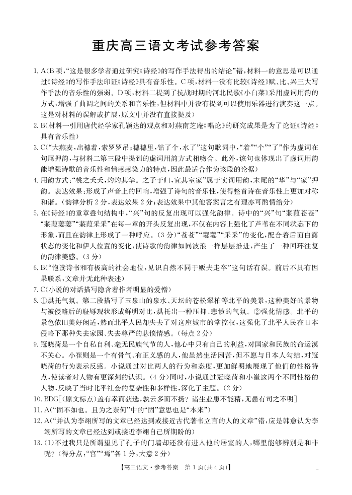 重庆市区域高中2024-2025学年下学期3月高三联考语文答案