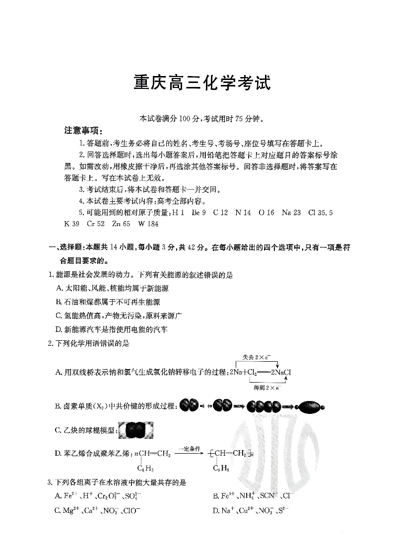 重庆市区域高中2024-2025学年下学期3月高三联考化学