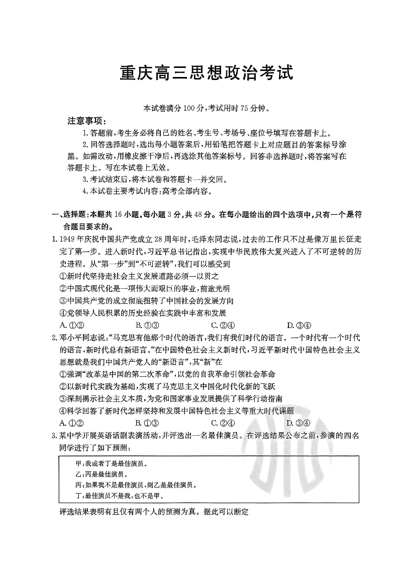 重庆市区域高中2024-2025学年下学期3月高三联考政治