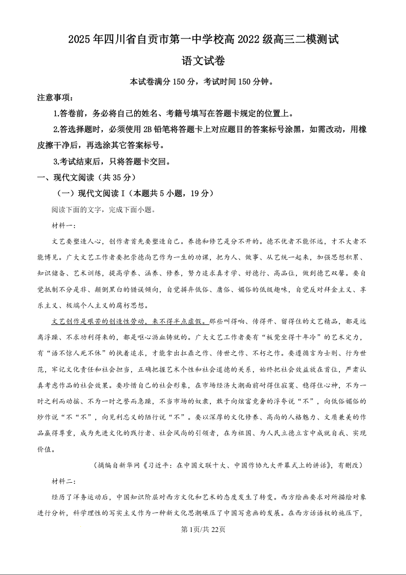 四川省自贡市一中2024-2025学年下学期高三二模考试语文(精品解析版)