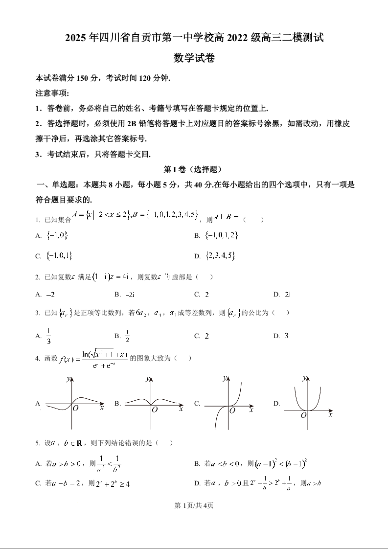 四川省自贡市一中2024-2025学年下学期高三二模考试数学(原卷版)