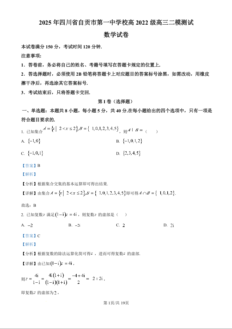 四川省自贡市一中2024-2025学年下学期高三二模考试数学(精品解析版)