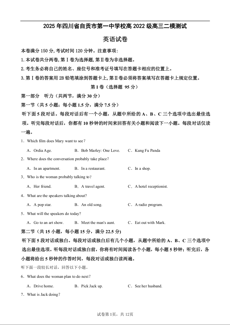 四川省自贡市一中2024-2025学年下学期高三二模考试英语+答案