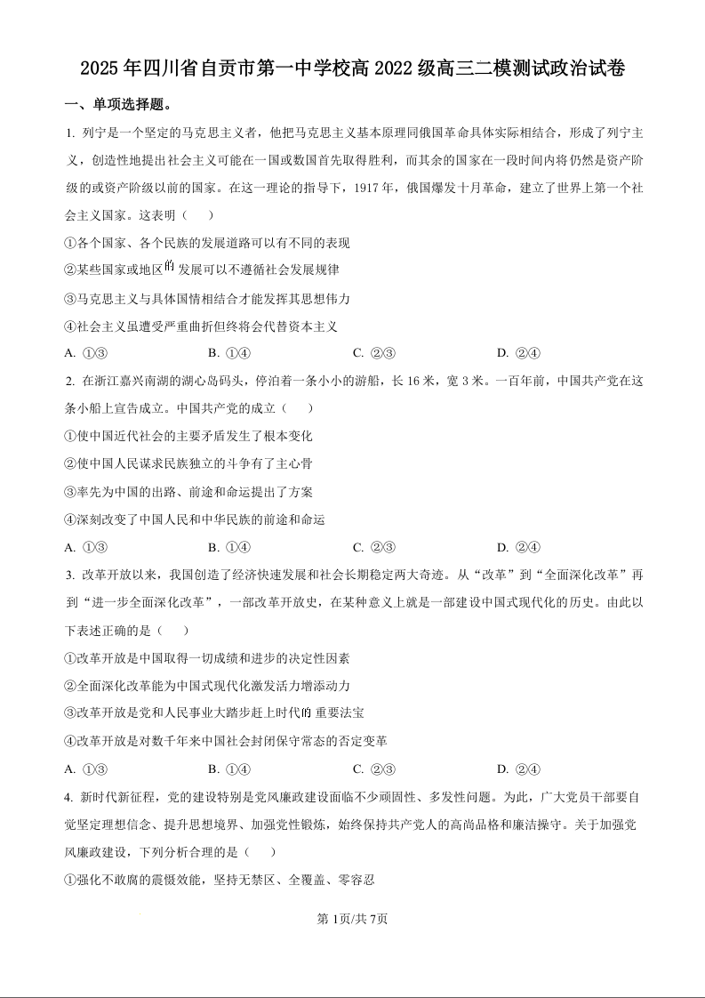 四川省自贡市一中2024-2025学年下学期高三二模考试政治(原卷版)