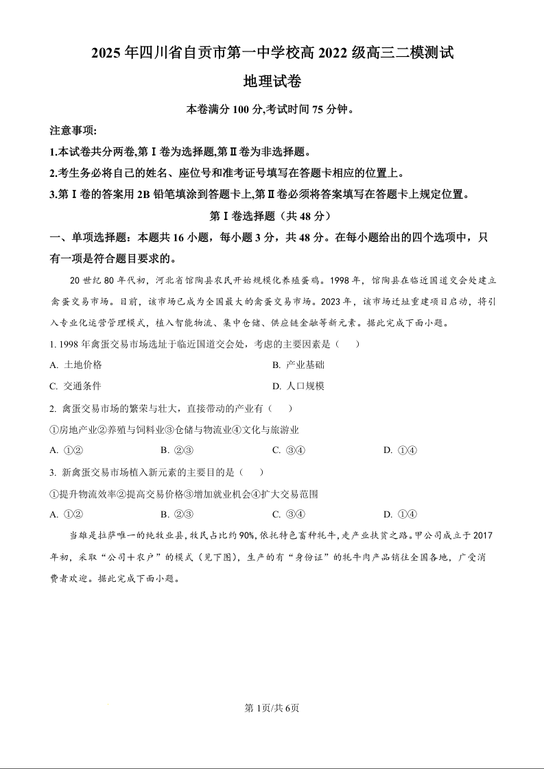 四川省自贡市一中2024-2025学年下学期高三二模考试地理(原卷版)
