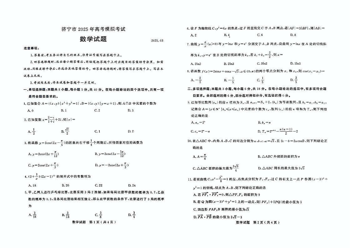 山东省济宁市2024-2025学年下学期3月高三模拟考试(一模)数学