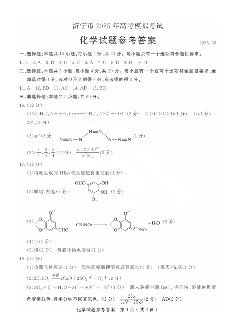 山东省济宁市2024-2025学年下学期3月高三模拟考试(一模)化学答案