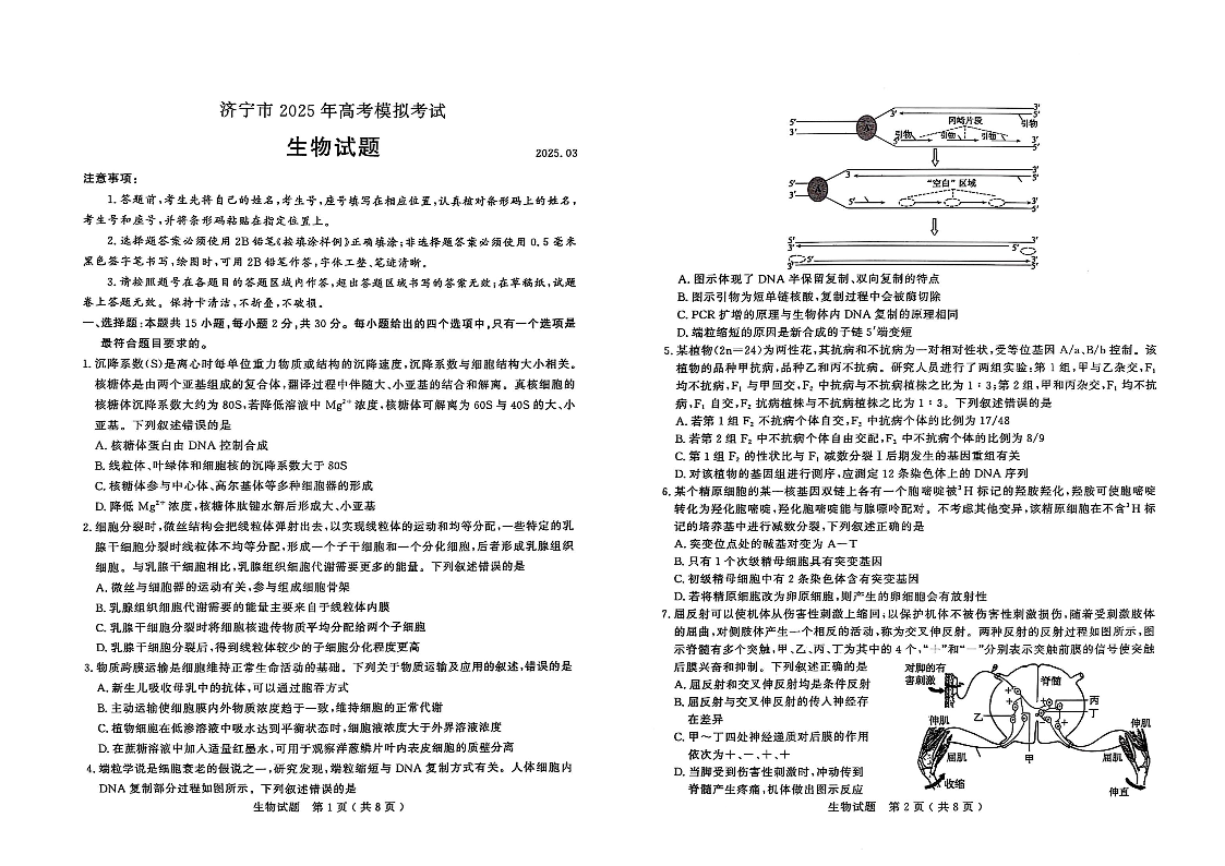 山东省济宁市2024-2025学年下学期3月高三模拟考试(一模)生物