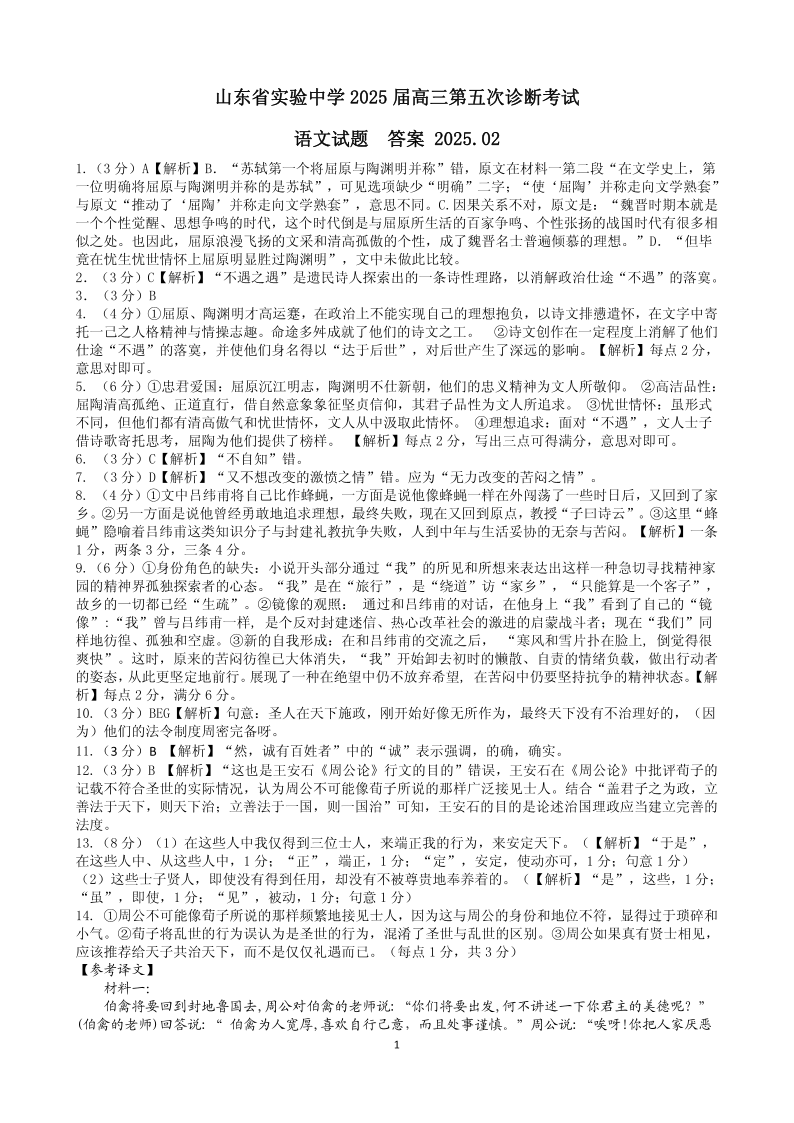 山东省实验中学2024-2025学年下学期3月高三第五次诊断考试语文答案