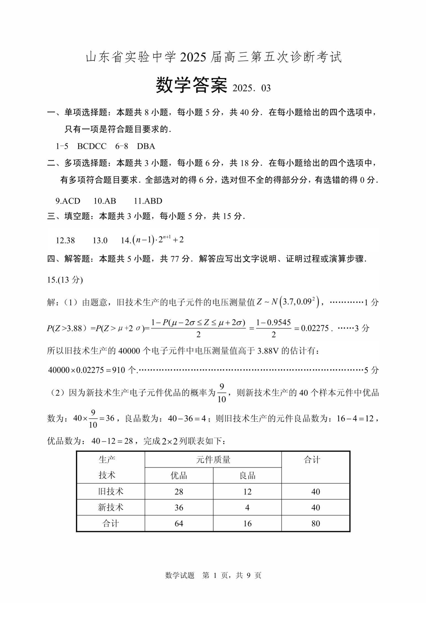 山东省实验中学2024-2025学年下学期3月高三第五次诊断考试数学答案