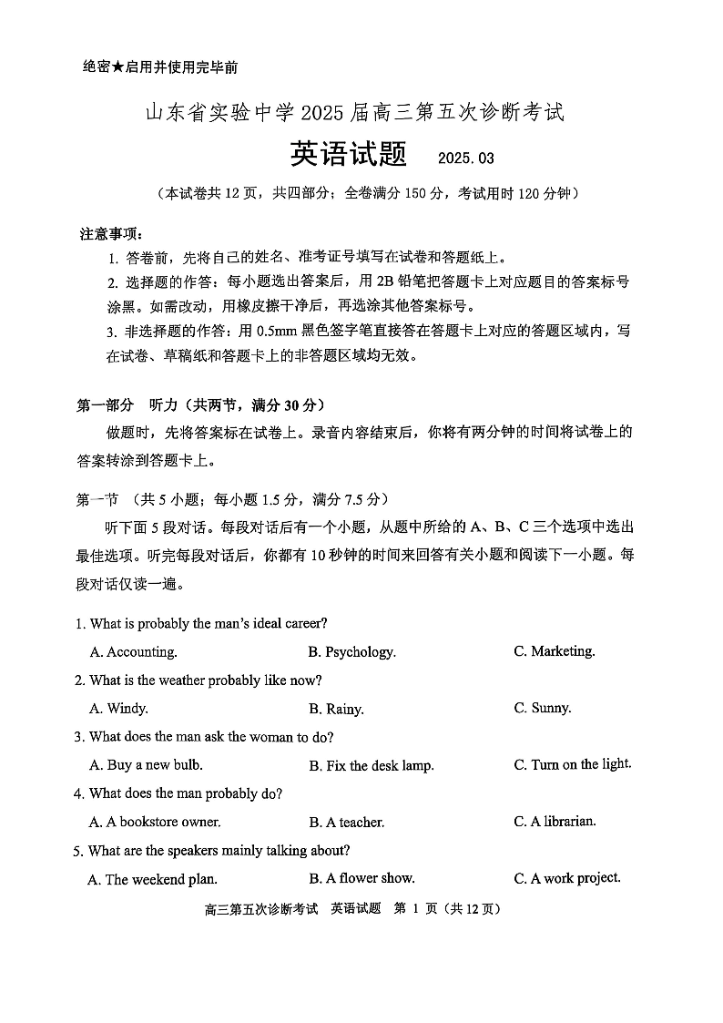 山东省实验中学2024-2025学年下学期3月高三第五次诊断考试英语