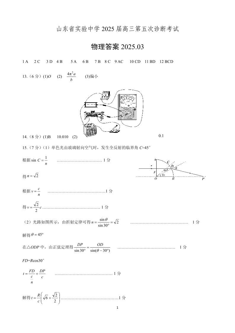 山东省实验中学2024-2025学年下学期3月高三第五次诊断考试物理答案