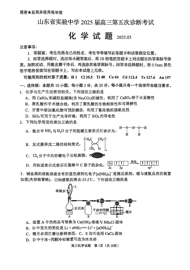 山东省实验中学2024-2025学年下学期3月高三第五次诊断考试化学
