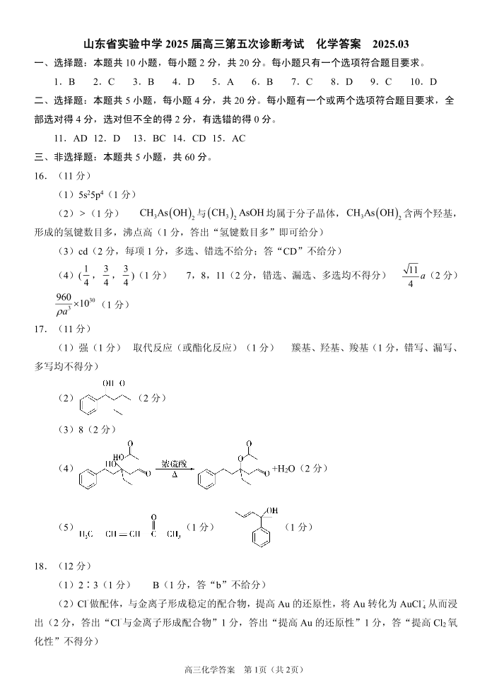 山东省实验中学2024-2025学年下学期3月高三第五次诊断考试化学答案