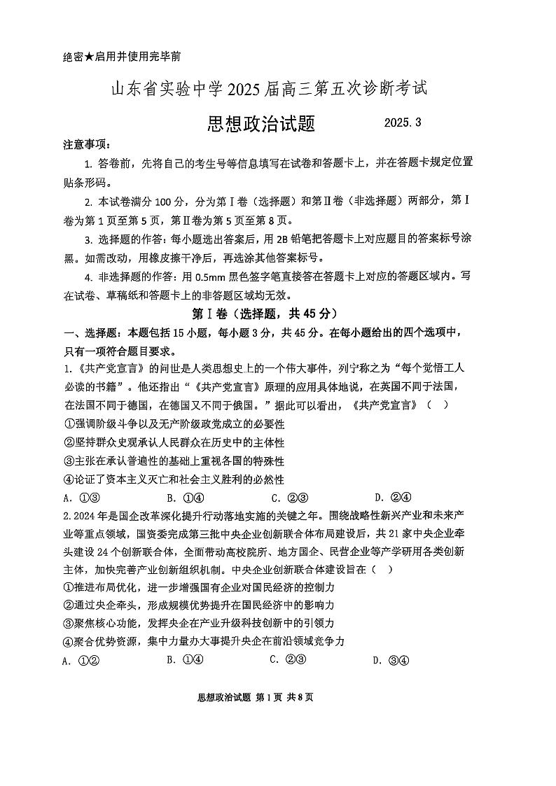 山东省实验中学2024-2025学年下学期3月高三第五次诊断考试政治