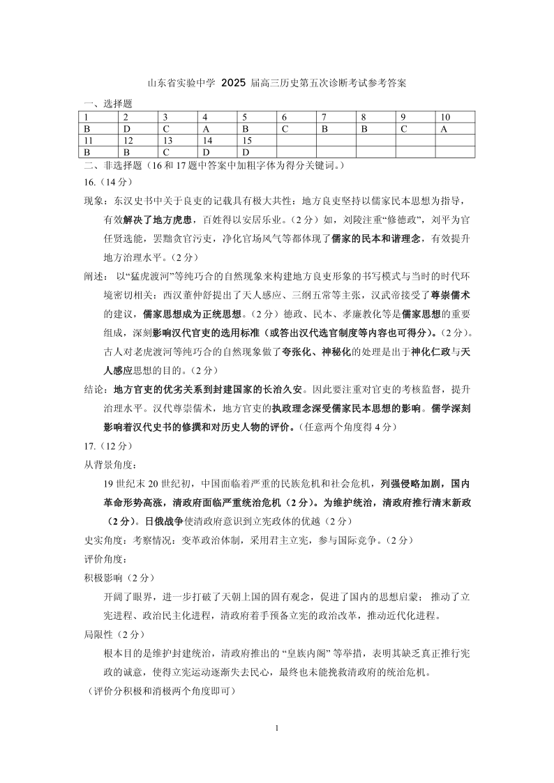 山东省实验中学2024-2025学年下学期3月高三第五次诊断考试历史答案