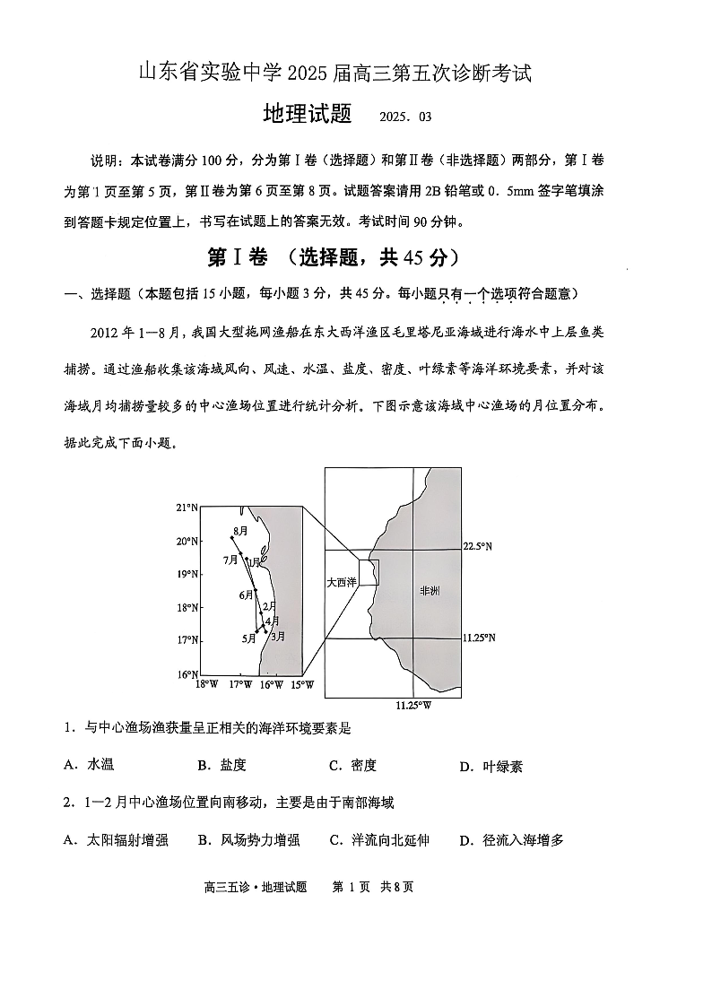 山东省实验中学2024-2025学年下学期3月高三第五次诊断考试地理