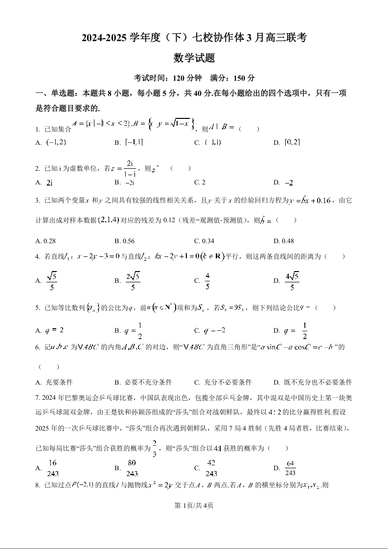 辽宁省七校协作体2024-2025学年下学期3月高三联考数学(原卷版)