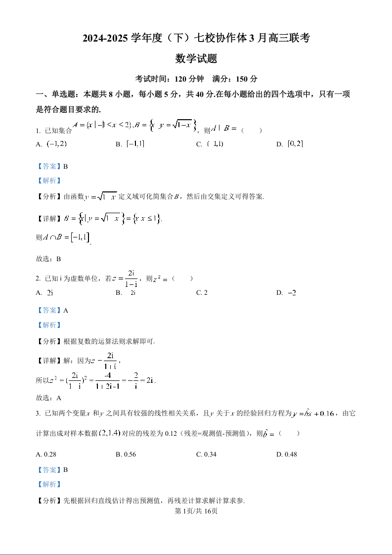 辽宁省七校协作体2024-2025学年下学期3月高三联考数学(精品解析版)