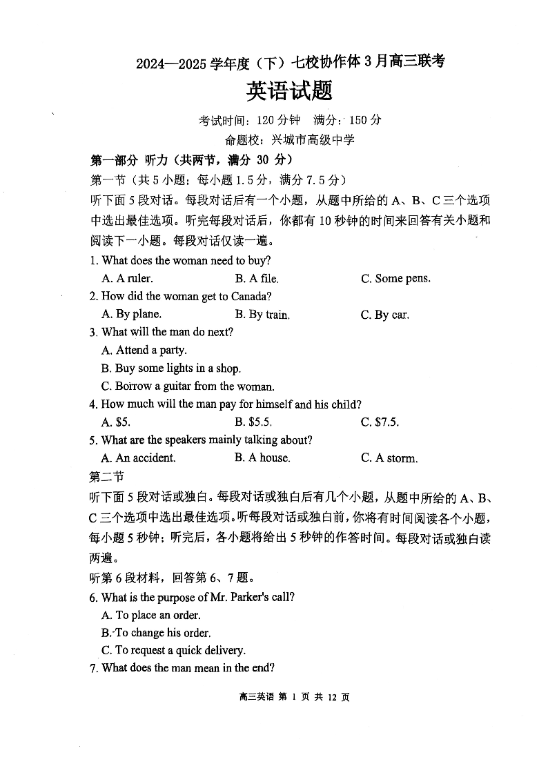 辽宁省七校协作体2024-2025学年下学期3月高三联考英语
