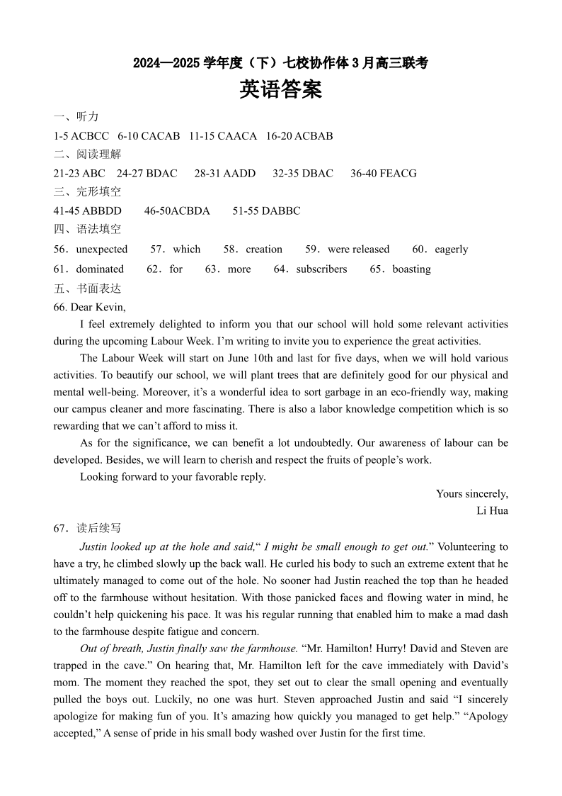 辽宁省七校协作体2024-2025学年下学期3月高三联考英语答案