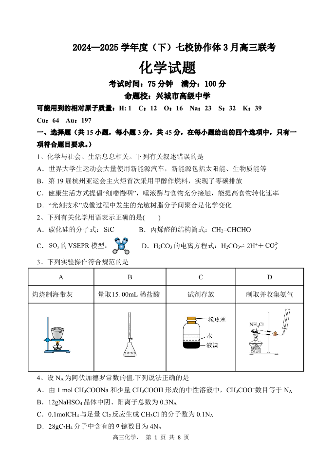 辽宁省七校协作体2024-2025学年下学期3月高三联考化学