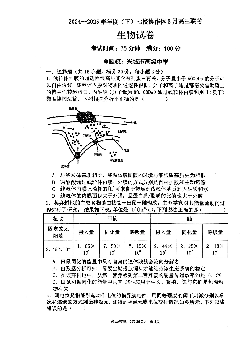 辽宁省七校协作体2024-2025学年下学期3月高三联考生物