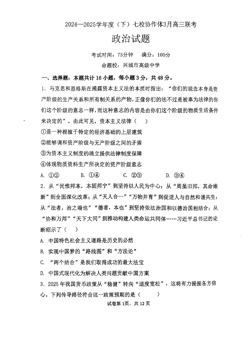 辽宁省七校协作体2024-2025学年下学期3月高三联考政治