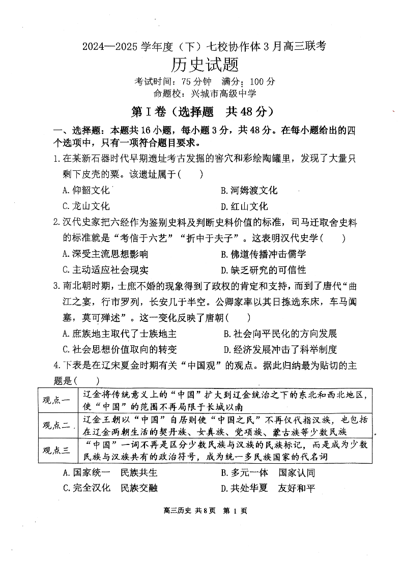 辽宁省七校协作体2024-2025学年下学期3月高三联考历史