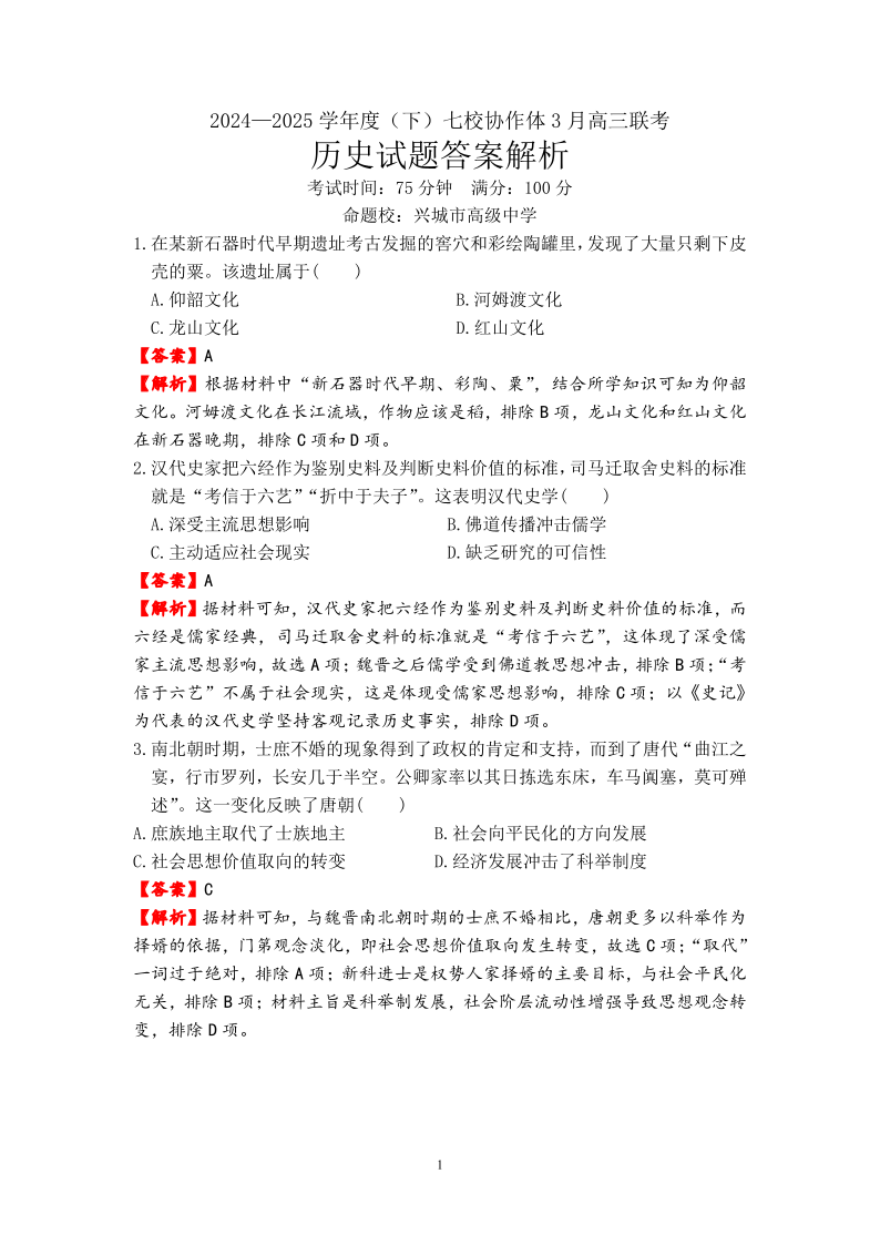辽宁省七校协作体2024-2025学年下学期3月高三联考历史答案