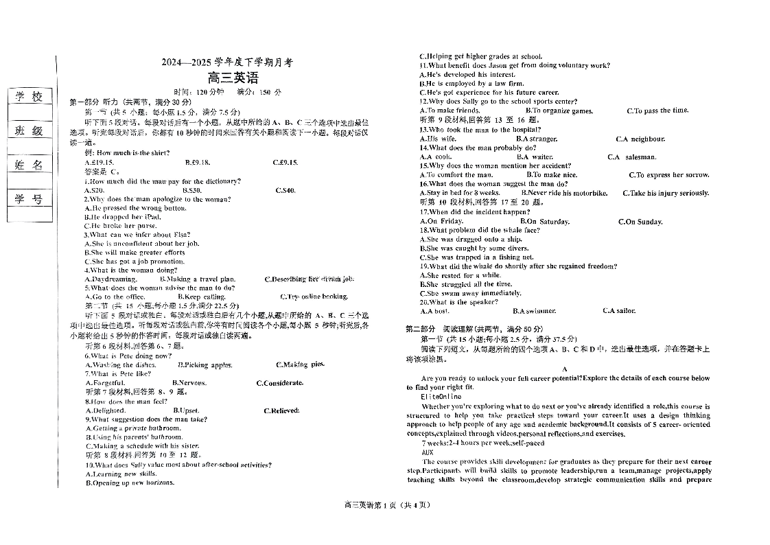 辽宁省鞍山市2024-2025学年下学期3月高三第一次月考英语