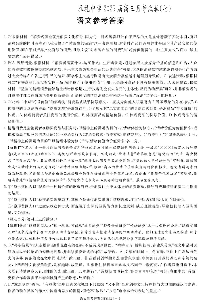 湖南省长沙市雅礼中学2024-2025学年下学期高三月考卷(七)语文答案