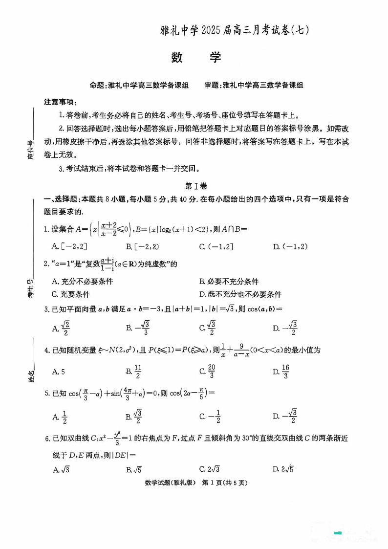 湖南省长沙市雅礼中学2024-2025学年下学期高三月考卷(七)数学