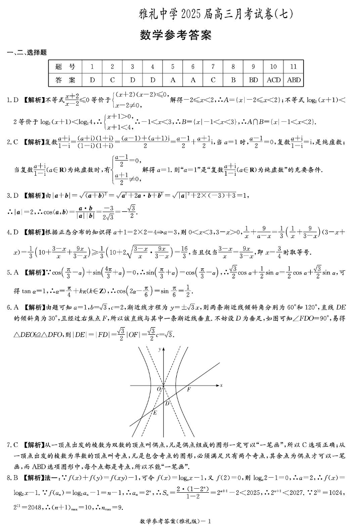 湖南省长沙市雅礼中学2024-2025学年下学期高三月考卷(七)数学答案