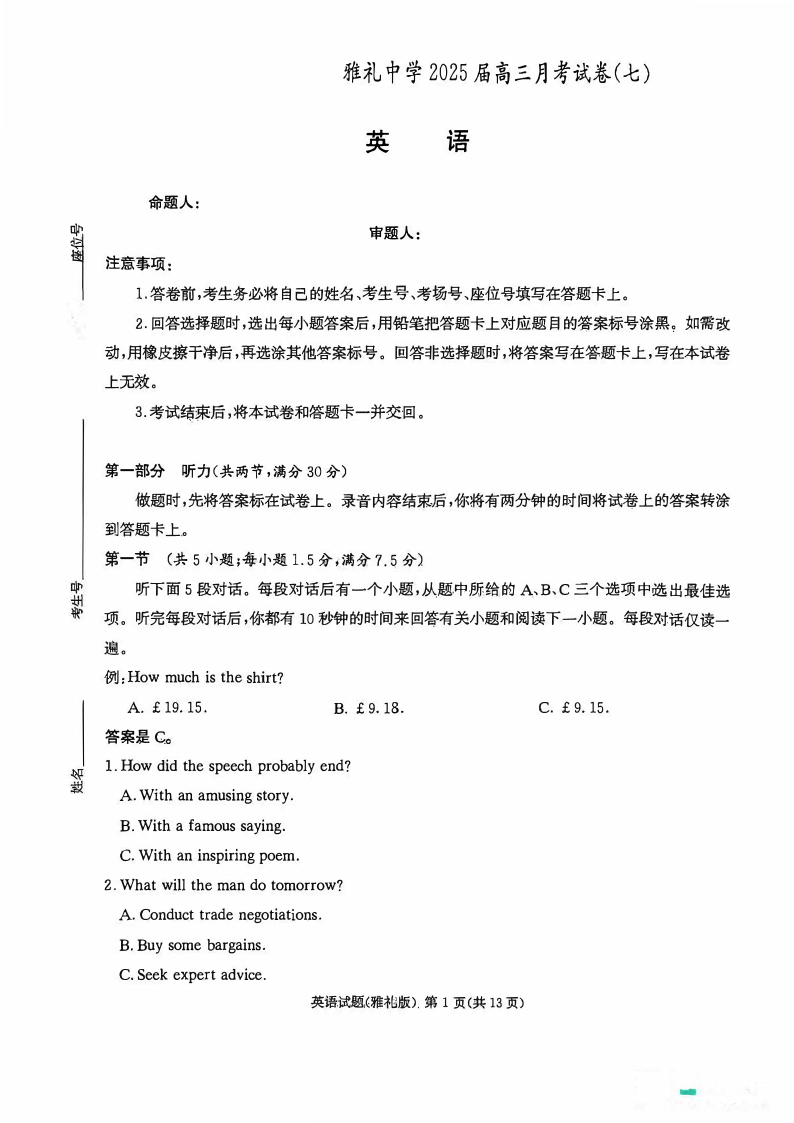 湖南省长沙市雅礼中学2024-2025学年下学期高三月考卷(七)英语