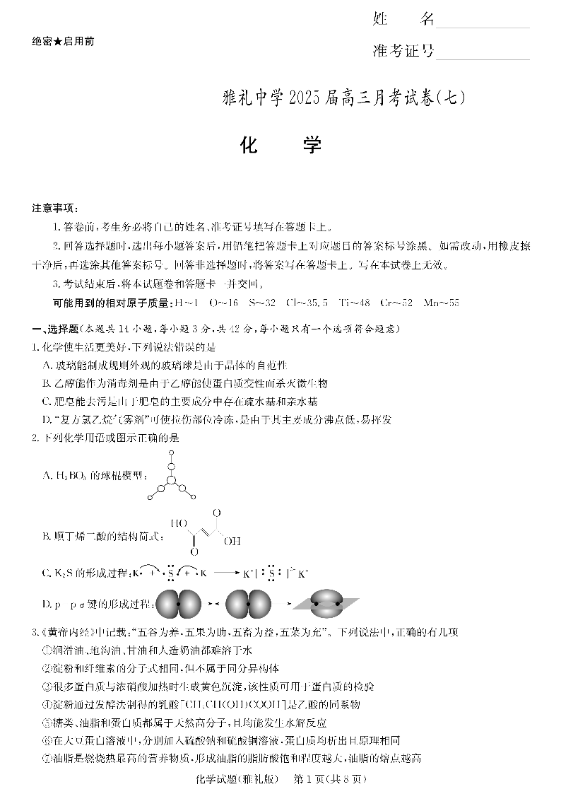 湖南省长沙市雅礼中学2024-2025学年下学期高三月考卷(七)化学