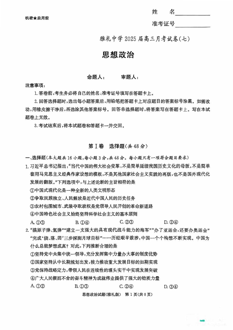 湖南省长沙市雅礼中学2024-2025学年下学期高三月考卷(七)政治
