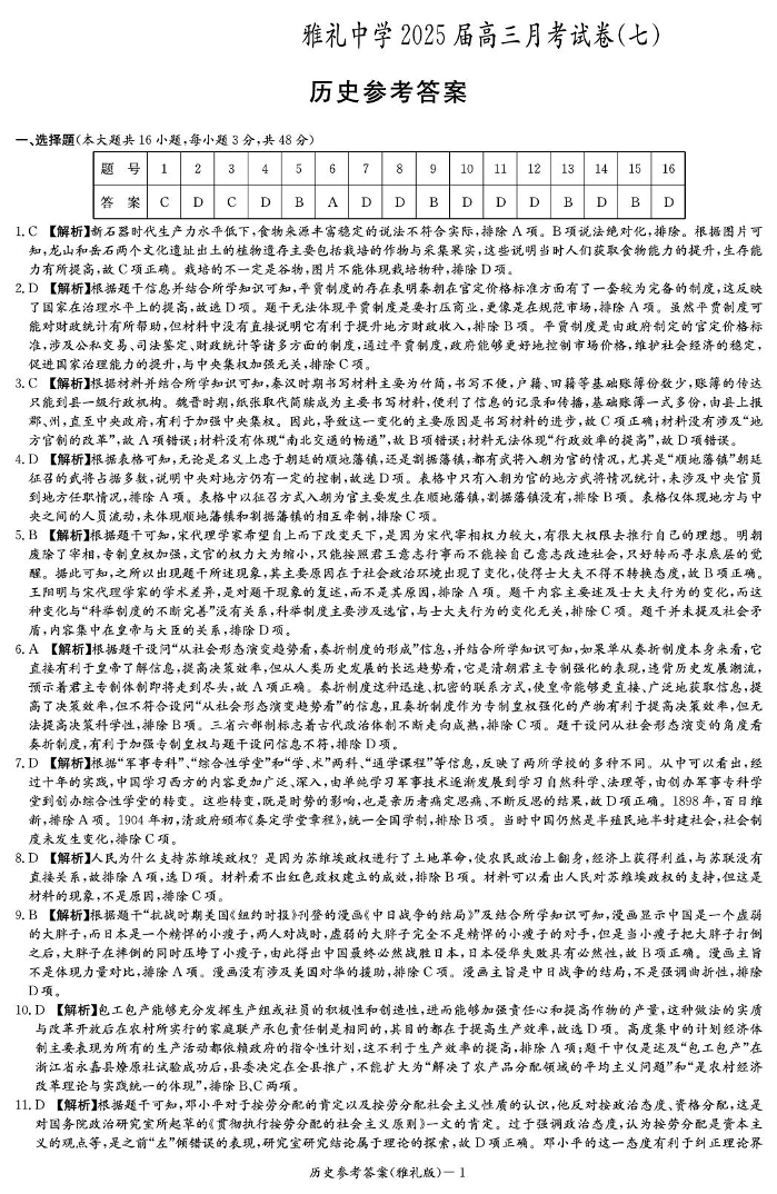 湖南省长沙市雅礼中学2024-2025学年下学期高三月考卷(七)历史答案