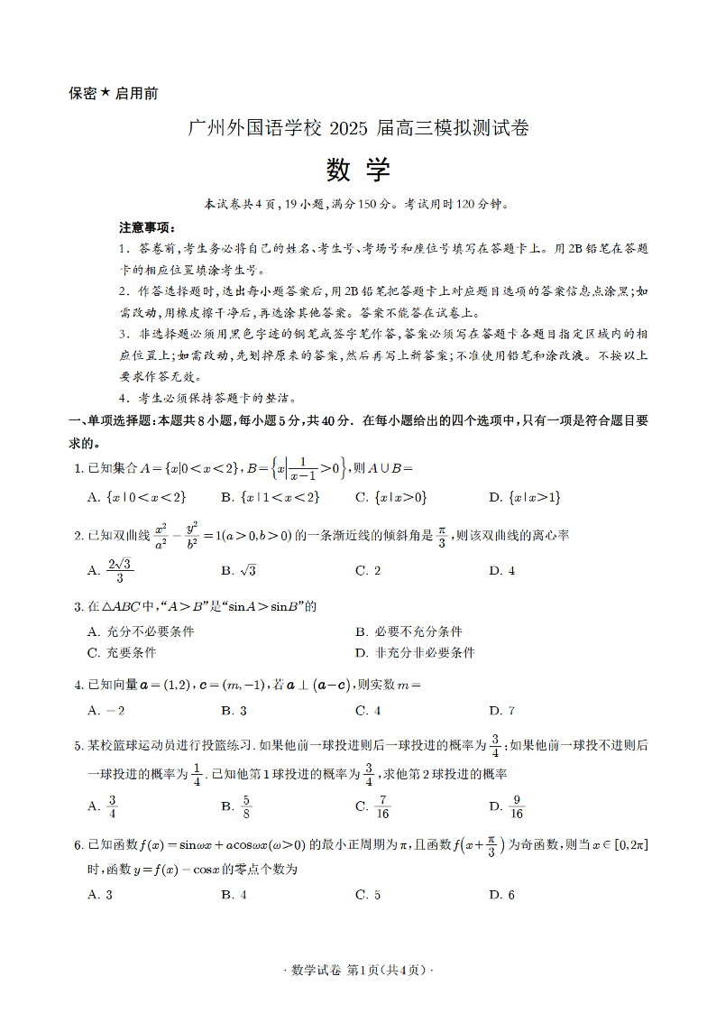 广东省外国语学校2024-2025学年下学期3月高三模拟测数学