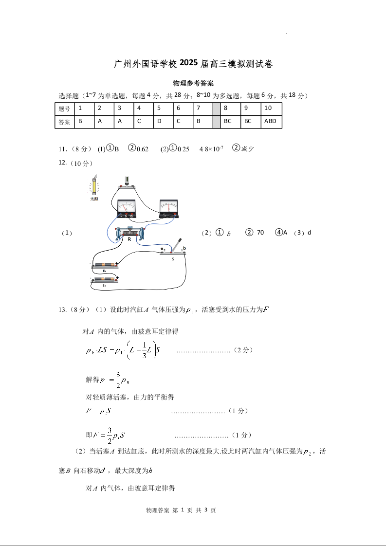 广东省外国语学校2024-2025学年下学期3月高三模拟测物理答案