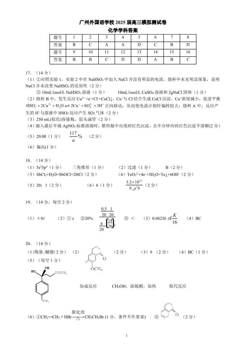 广东省外国语学校2024-2025学年下学期3月高三模拟测化学答案