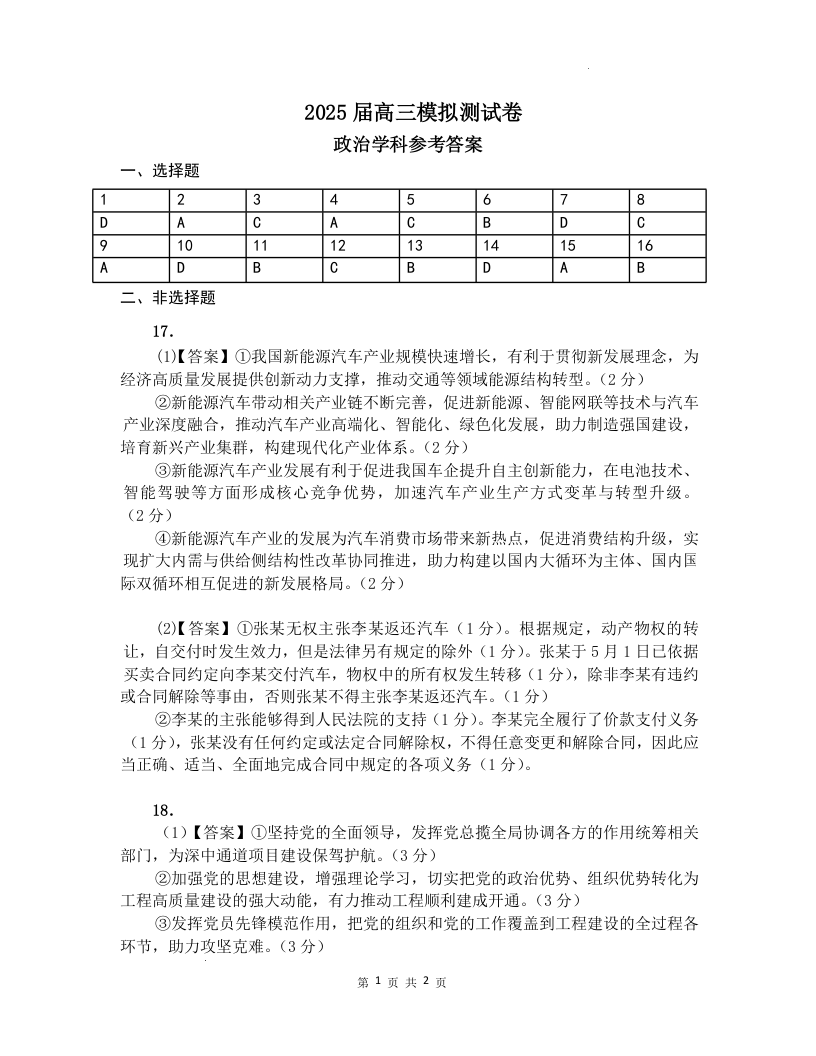 广东省外国语学校2024-2025学年下学期3月高三模拟测政治答案