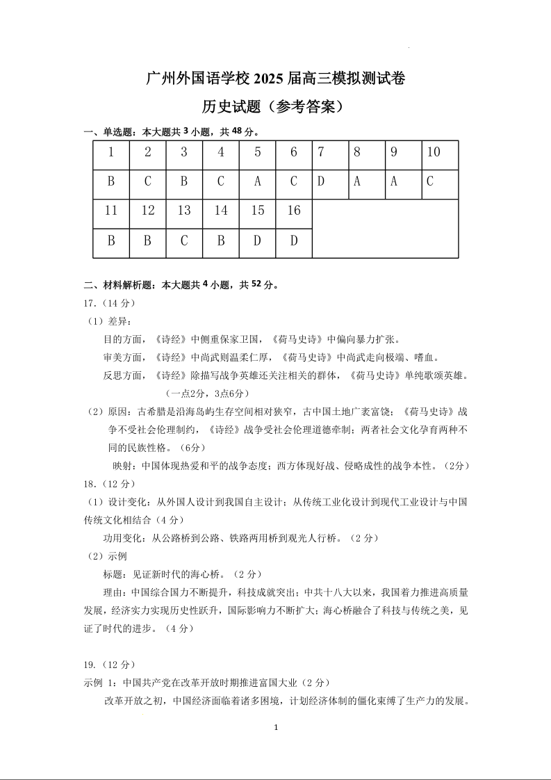 广东省外国语学校2024-2025学年下学期3月高三模拟测历史答案