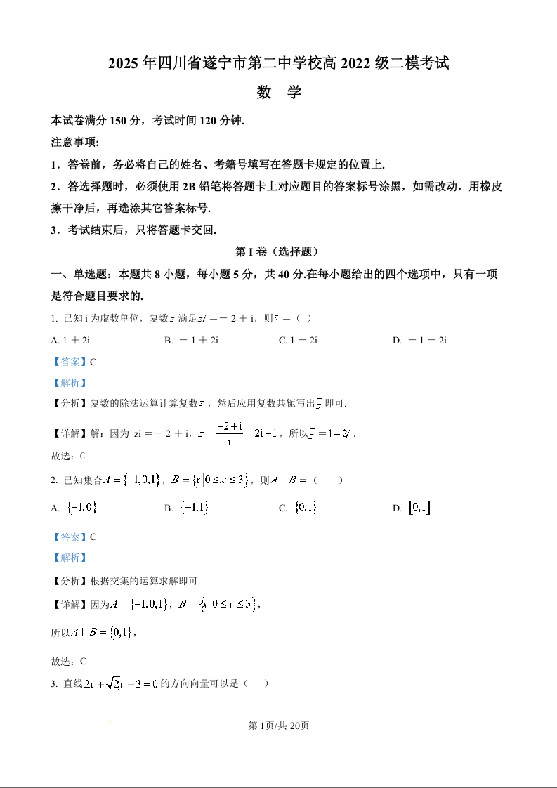 四川省遂宁市第二中学2024-2025学年下学期3月高三二模考试数学(精品解析版)