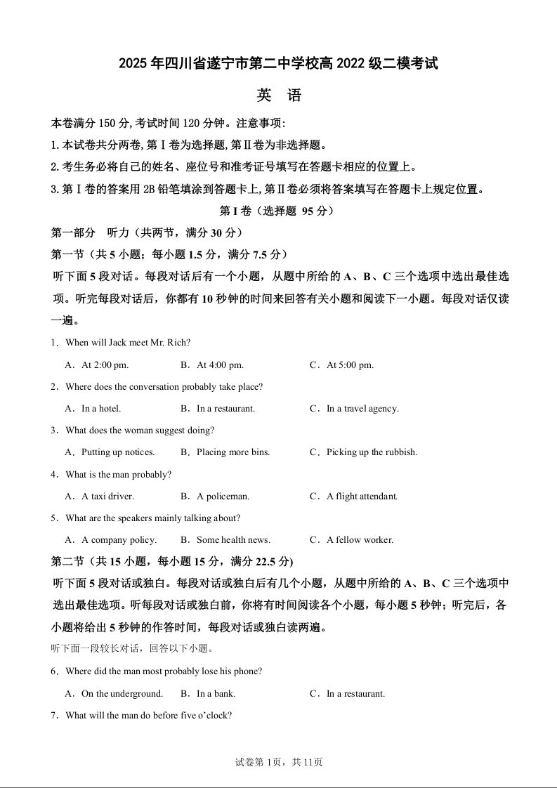 四川省遂宁市第二中学2024-2025学年下学期3月高三二模考试英语+答案