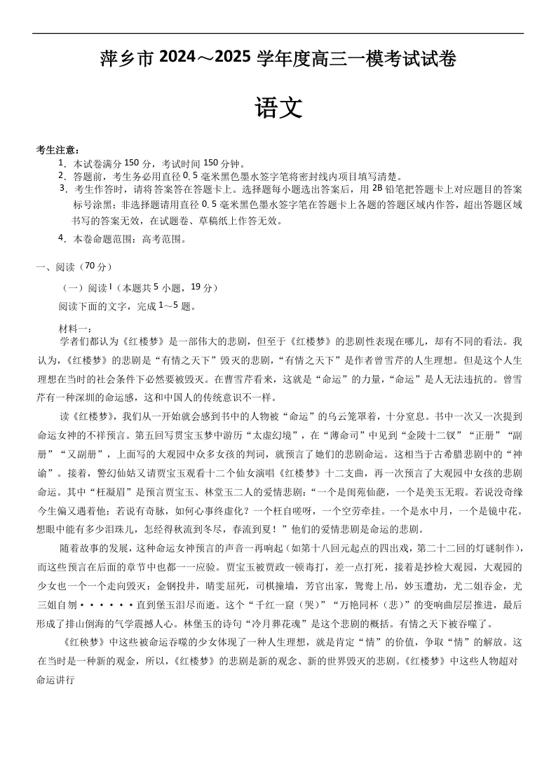 江西省萍乡市2024-2025学年下学期3月高三一模考试语文+答案