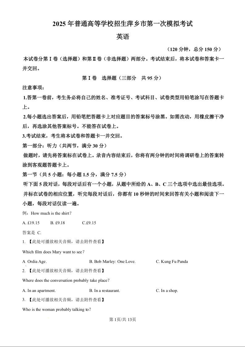 江西省萍乡市2024-2025学年下学期3月高三一模考试英语(原卷版)