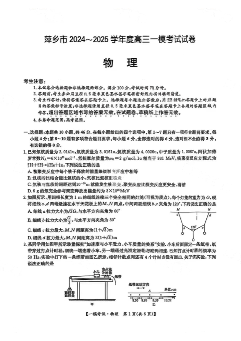 江西省萍乡市2024-2025学年下学期3月高三一模考试物理+答案