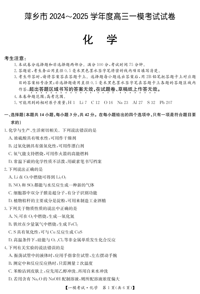 江西省萍乡市2024-2025学年下学期3月高三一模考试化学
