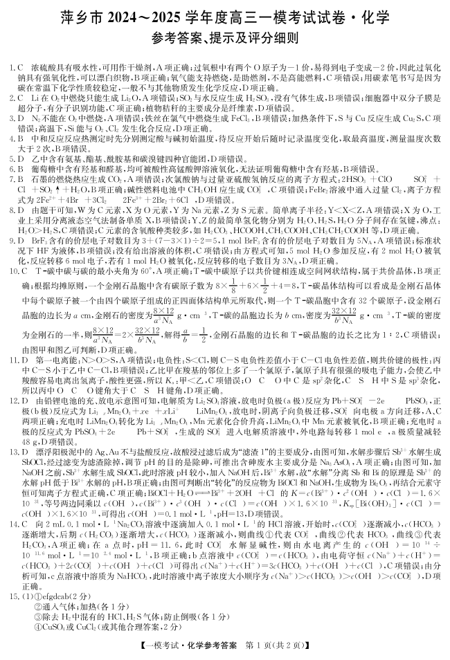 江西省萍乡市2024-2025学年下学期3月高三一模考试化学答案